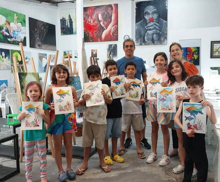 Nossos cursos são projetados para todas as idades, incluindo arte para crianças, promovendo o desenvolvimento de habilidades artísticas e a confiança em cada aluno durante o processo de aprendizado.